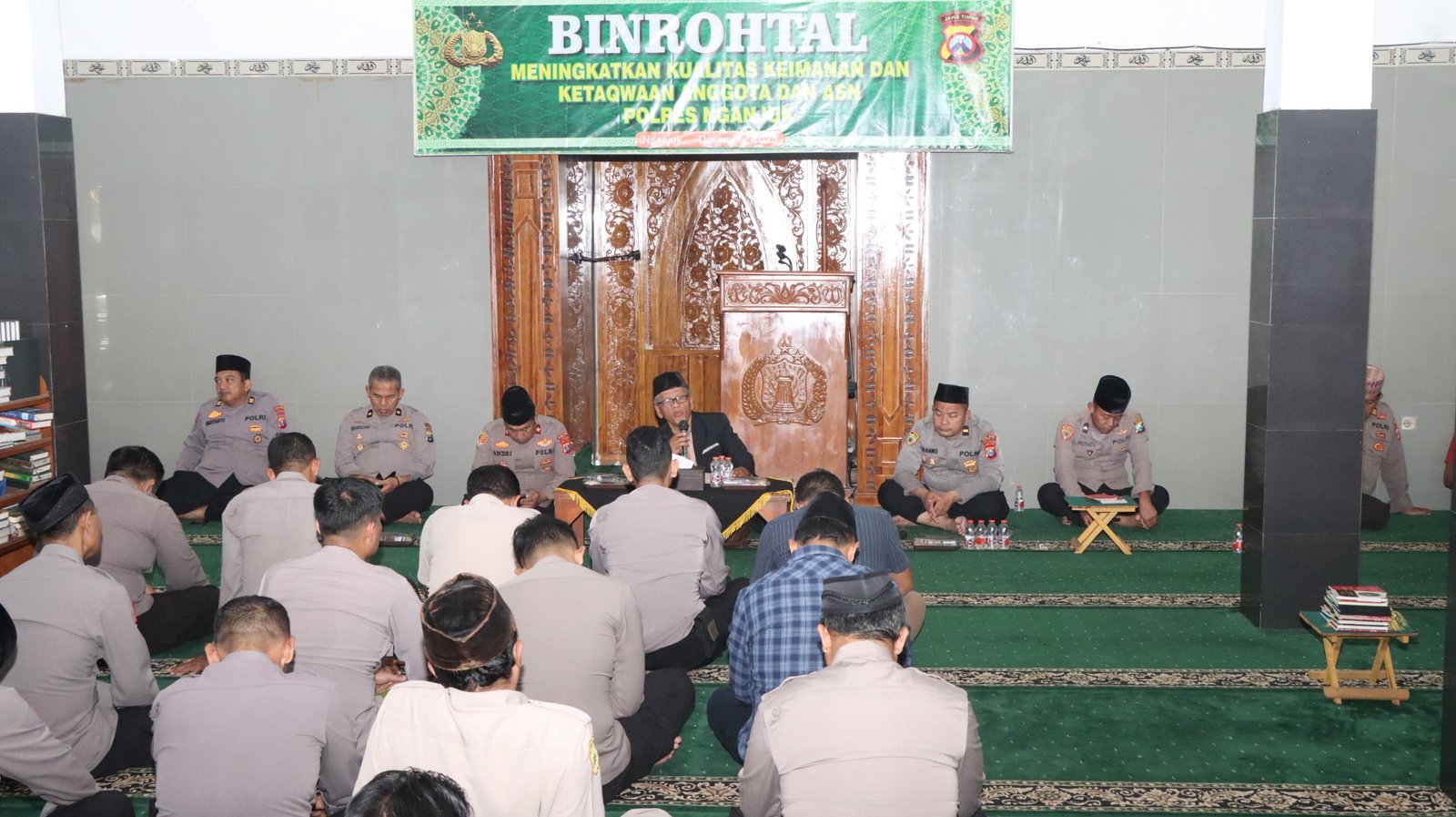 “Binrohtal ini menjadi sarana untuk menyeimbangkan tugas kedinasan dengan penguatan spiritual. Dengan iman yang kuat, diharapkan seluruh personel mampu menjalankan tugas secara profesional, tulus, dan penuh tanggung jawab kepada masyarakat,” ujar KOMPOL Andria Diana Putra menyampaikan pesan Kapolres Nganjuk.