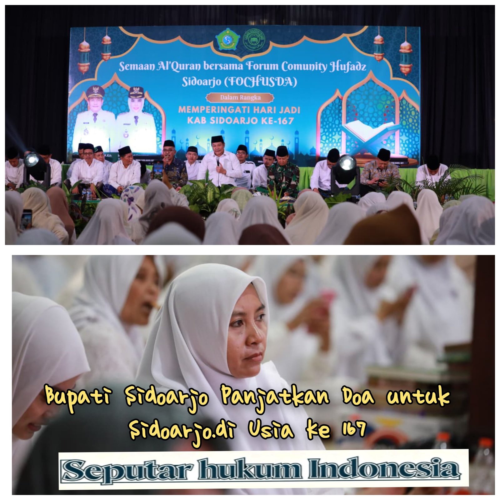 Seputar hukum Indonesia Sidoarjo, Bupati Sidoarjo memimpin Semaan Al-Qur’an bersama Forum Community Huffadz Sidoarjo (Fochusda) di Pendopo Delta Wibawa pada Sabtu malam (6/2/2026). Kegiatan ini menjadi doa bersama ribuan jamaah untuk Kabupaten Sidoarjo agar terus tumbuh sebagai daerah yang diberkahi di usia ke-167 tahun.