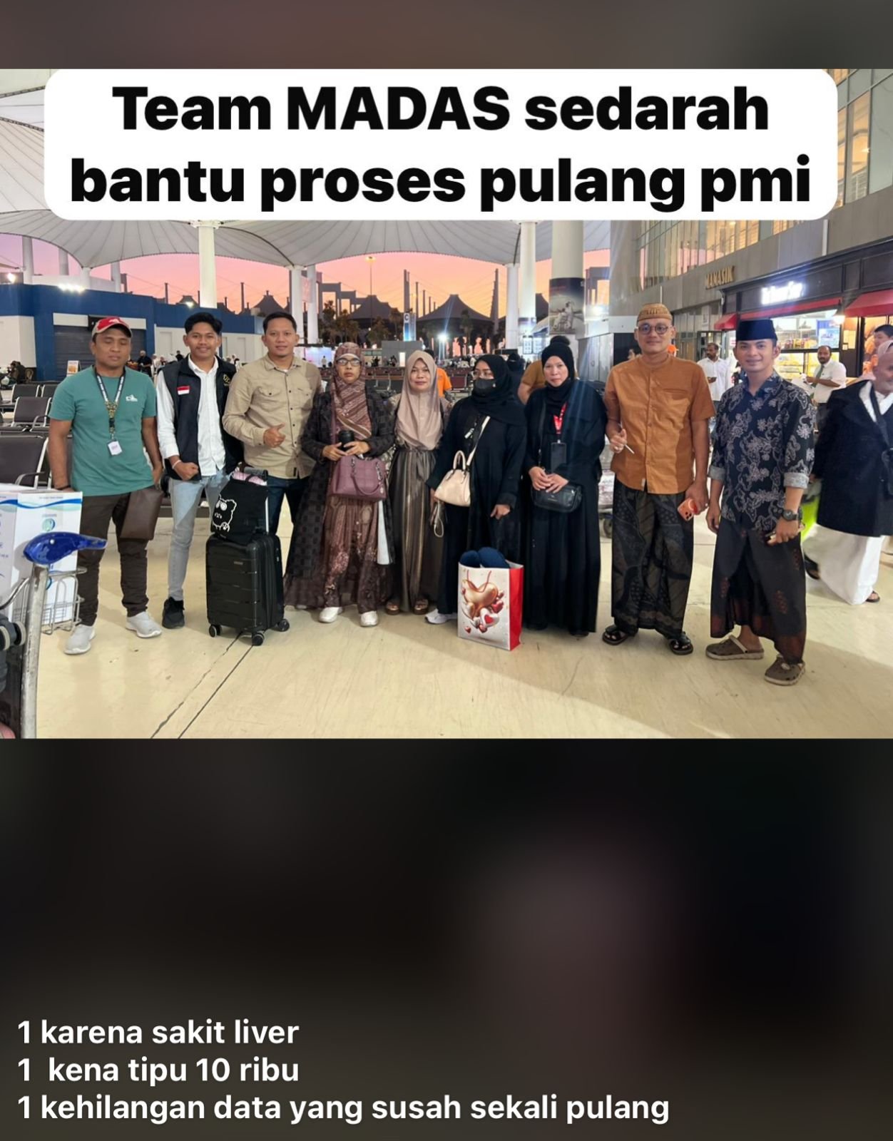 Melalui kepemimpinan Ketua DPCI MADAS SEDARAH Arab Saudi, Khairul Azam, bersama seluruh Tim MADAS SEDARAH, sebanyak empat orang PMI berhasil didampingi secara menyeluruh, mulai dari pengurusan dokumen, penyelesaian administrasi keimigrasian, hingga proses kepulangan ke Indonesia.
