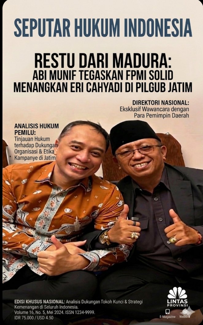 Seputar Hukum Indonesia Surabaya_ – Dukungan untuk Wali Kota Surabaya Eri Cahyadi maju sebagai calon Gubernur Jawa Timur periode mendatang terus menguat. Kali ini, restu datang dari Ketua Dewan Pimpinan Daerah Front Pemuda dan Madura Indonesia (DPD FPMI) Jawa Timur, Abi Munif.