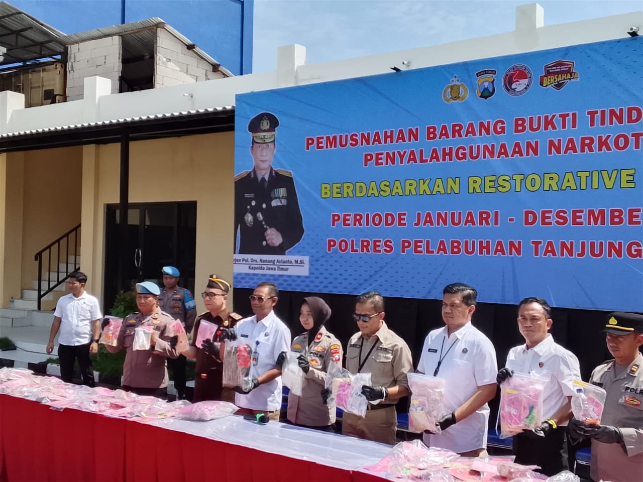Menurut keterangan Wakapolres Pelabuhan Tanjung Perak Kompol Anindita Harcahyaningdyah, S.I.K., mengatakan,” terimakasih kepada semua yang hadir dalam kegiatan yang di adakan di Polres Pelabuhan Tanjung Perak yaitu pemusnahan barang bukti Narkoba dari Satresnarkoba dalam kurun waktu dari Januari sampai Desember 2025, yang telah menangani sebayak tiga ratus empat kasus,yang diantaranya tiga ratus dua kasus diselesaikan melalui mekanisme Restoratif Justice (RJ), 1 kasus yang tersangka meninggal dunia dan juga satu kasus merupakan barang temuan dengan jumlah barang bukti Narkoba Golongan satu jenis sabu sebanyak 1034 gram, ganja sebanyak 1038 gram, pil ekstasi sebanyak 8 butir, dan juga 4,01 gram, pipet kaca sebanyak 202, dan juga alat hisap sabu bong sebanyak 85 buah,” jelasnya.